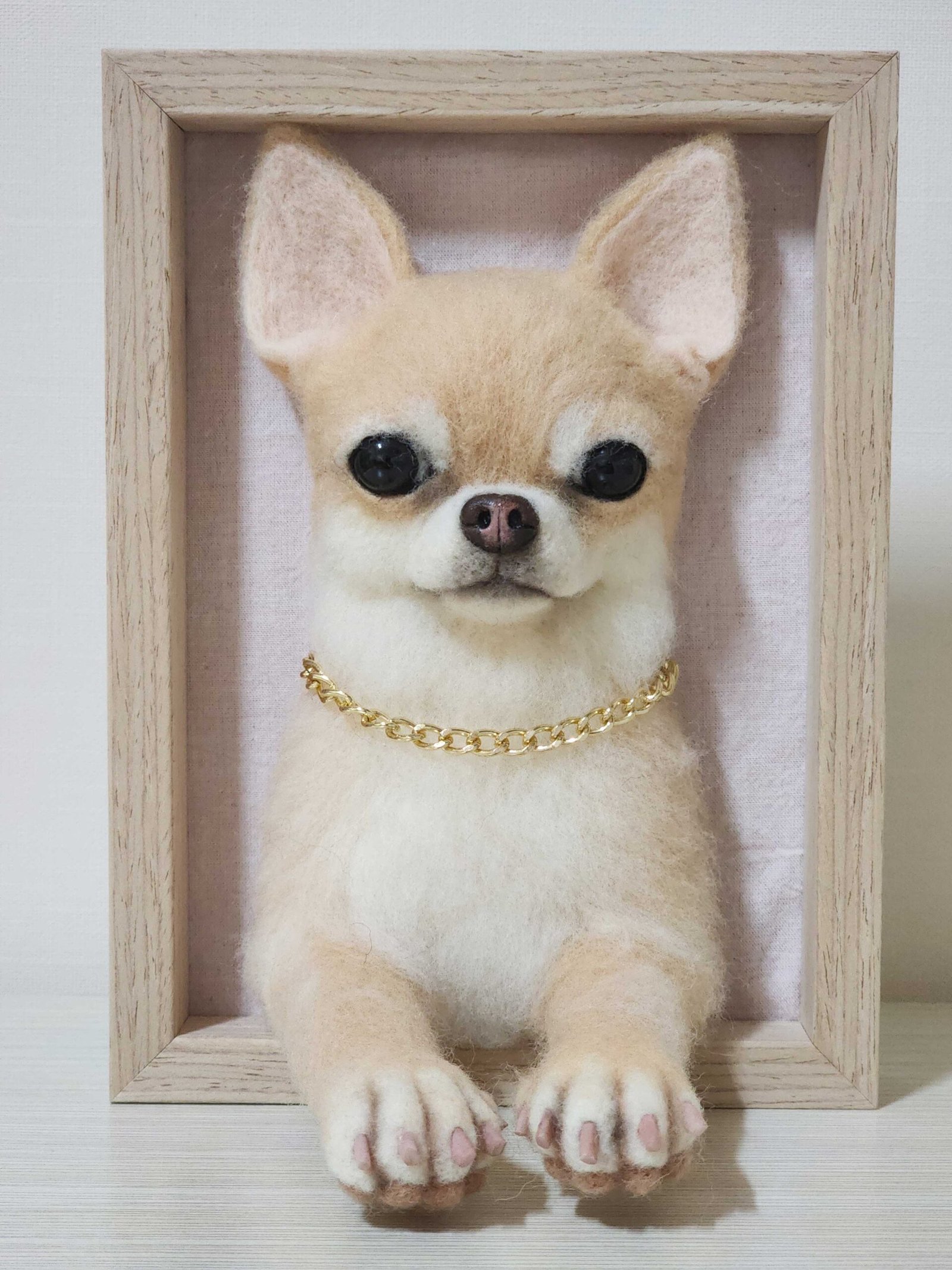Basic needle felted sculpture of a dog in a wooden picture frame sized 5x7inches